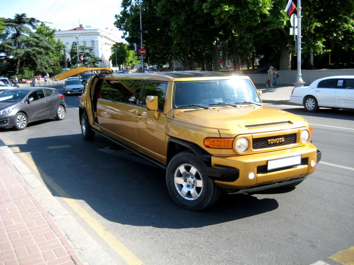 Эксклюзивные модели авто всегда особо привлекают внимание. Яркий Лимузин Тойота FJ Круизер - Toyota FJ Cruiser limo - золотого цвета, пожалуй, единственный в мире. Это и делает его особенным и эксклюзивным.