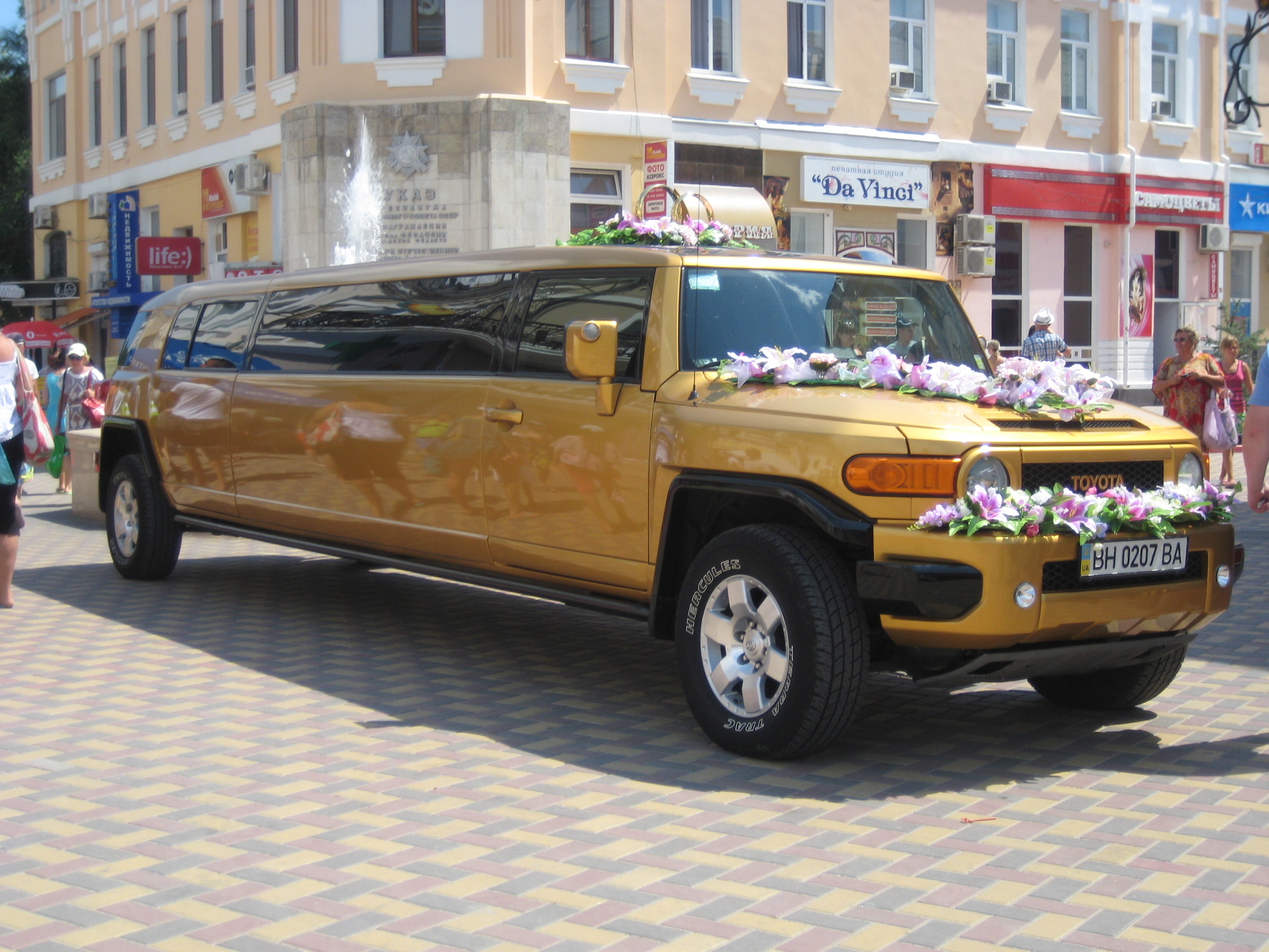 Как свадебный лимузин FJ по-своему хорош. Украшеный должным образом, FJ теряет свою брутальность, приобретает романтичный вид. А в случае использования золотого цвета в аксессуарах и элементах торжества, золотой лимузин просто незаменим.